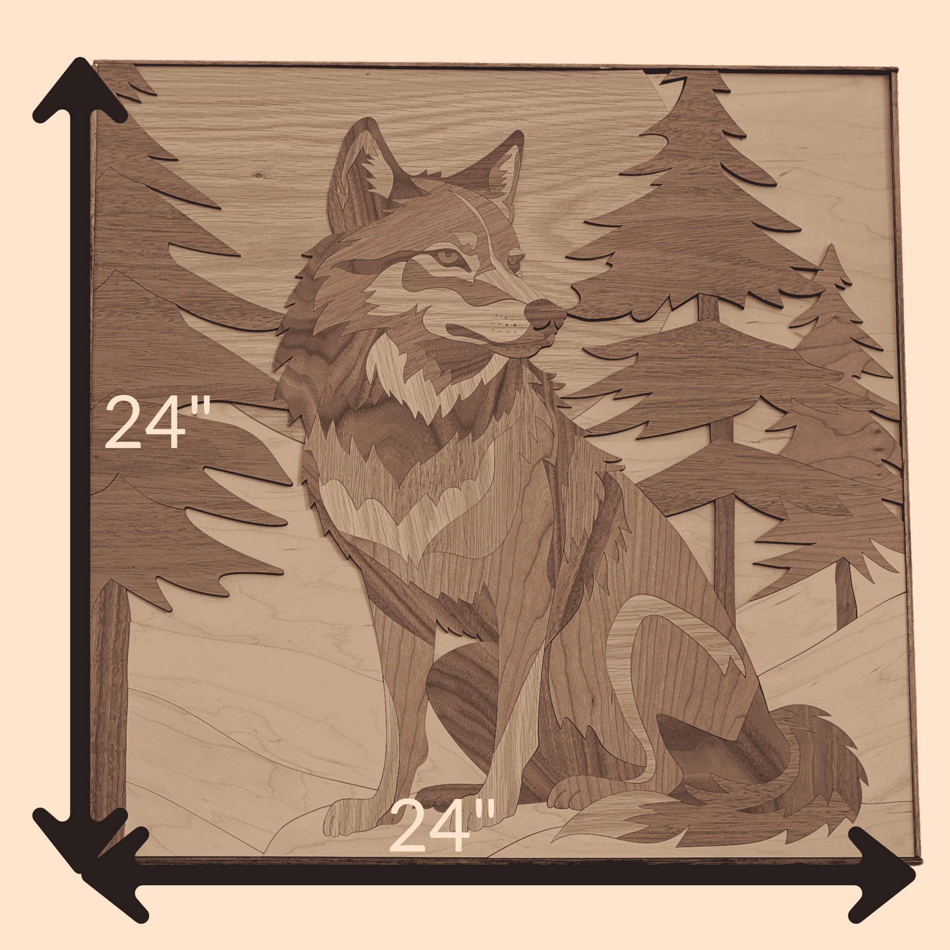 A wood wall hanging of a majestic wolf. Meticulously handcrafted from a variety of hardwoods, each piece is laser-cut and layered by hand to build depth, rich contrast, and tactile texture. The design depicts a seated wolf framed by forest elements—trees, undergrowth, and shifting shadow—where varied wood tones and grain patterns define the wolf’s fur, the bark’s ruggedness, and the dappled light of the woods. Finished with fine sanding and a clear matte seal to enhance natural color while preserving a tactile, handcrafted feel. Ready-to-hang with a discreet mounting. Natural variations in wood grain and hue ensure every wall hanging is a unique portrait of the wild.