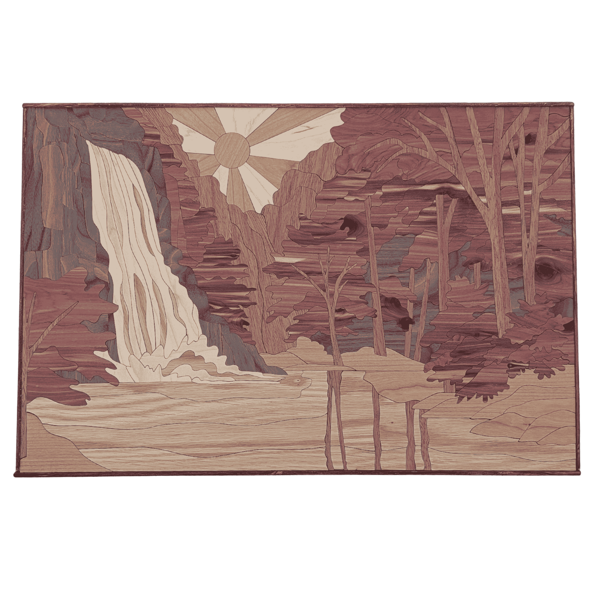- Design: Layered composition with lighter woods for water and darker woods for cliffs and trees.