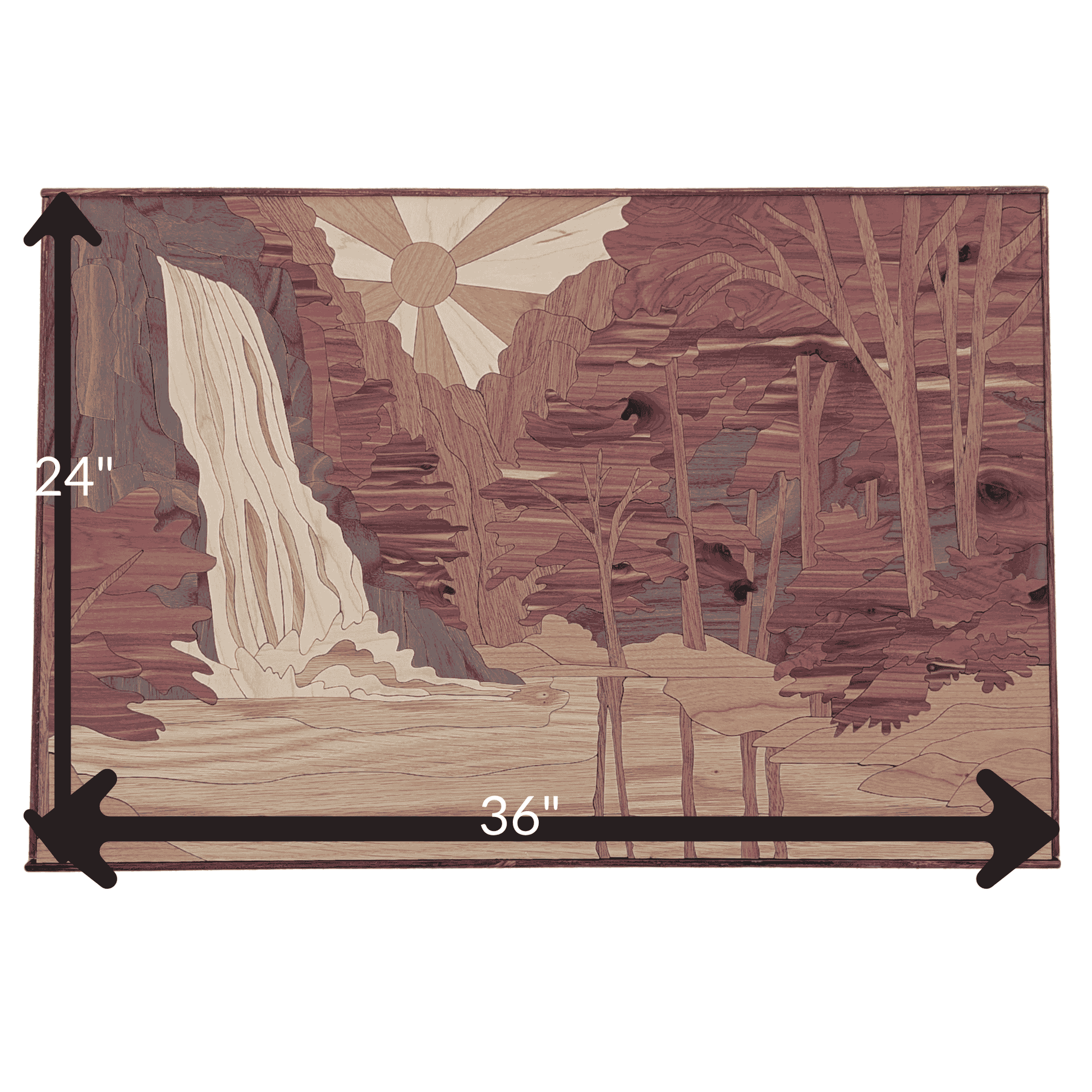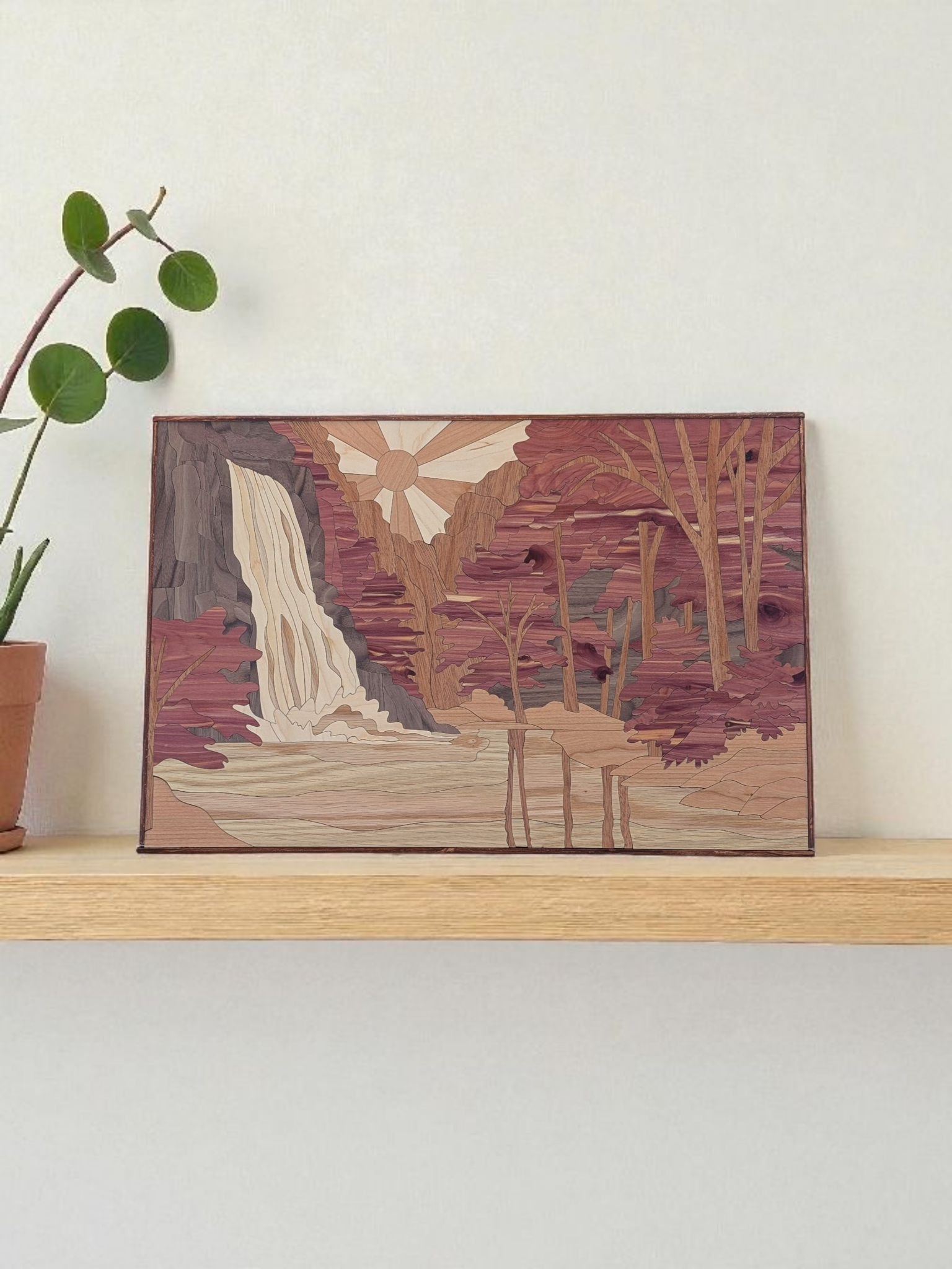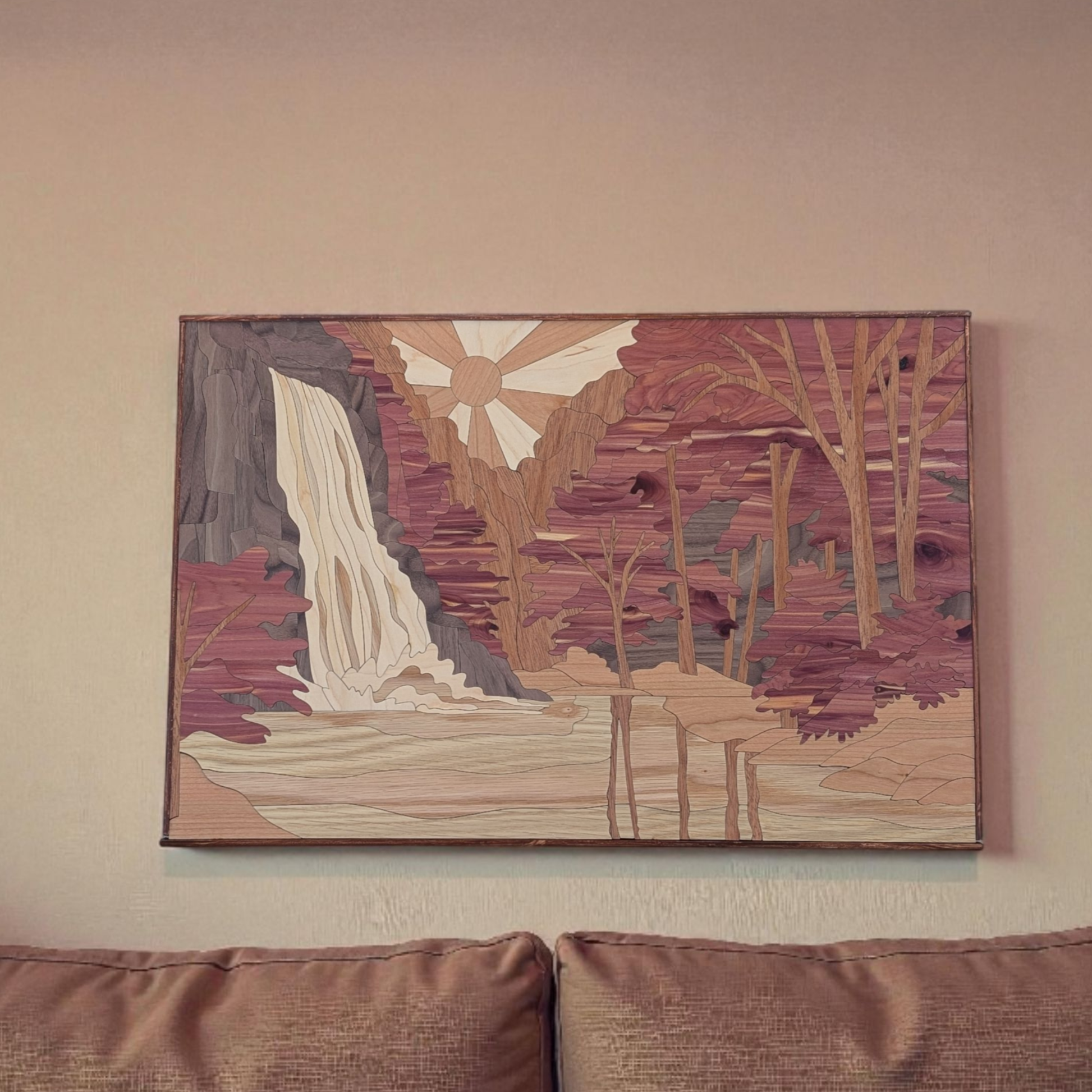Cascade Reverie — 36" x 24" handcrafted wall hanging made from layered natural woods. A silvery waterfall flows through textured rock, trees, and mountain ridges, using varied wood tones and thicknesses for depth and a subtle 3D effect.